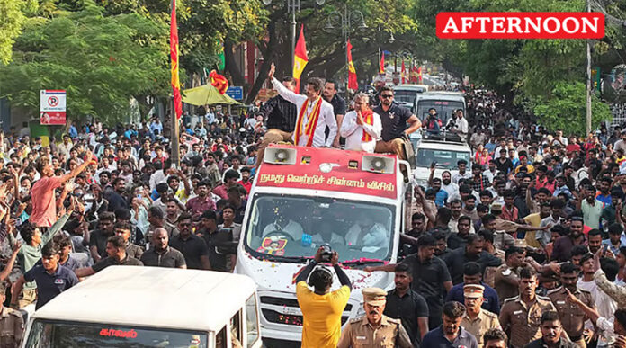 According to police, Vijay conducted campaign events at T. Nagar, Thousand Lights and Egmore on Wednesday, drawing large crowds at multiple locations. His campaign vehicle reached Muthurangan Road in T. Nagar around 4.10 p.m., where a significant number of people had gathered.