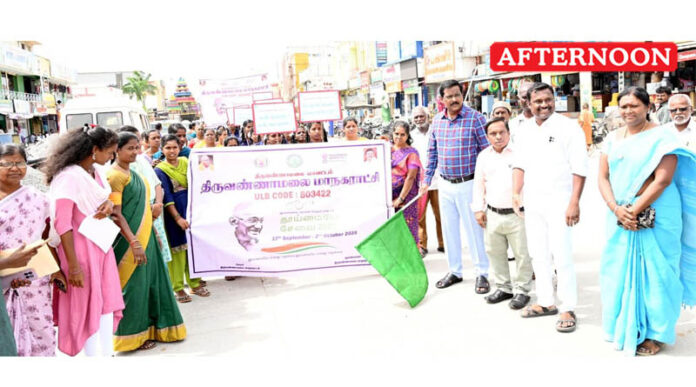 The rally, flagged off near the Gandhi statue, witnessed active participation from more than 200 students of Tiruvannamalai Municipal Girls’ Higher Secondary School. Holding placards and banners with cleanliness slogans, the students spread awareness among the public on the importance of hygiene and sanitation.