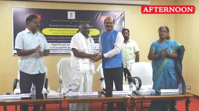 Dr. P. Govindaraj, Director of ICAR–SBI, presided and highlighted the benefits of the newly launched programmes and the Agriculture Infrastructure Fund. Over 330 farmers attended, with sessions by experts from ICAR institutes and Tamil Nadu Agricultural University covering topics such as intercropping pulses with sugarcane, mechanization, variety protection, and natural farming.