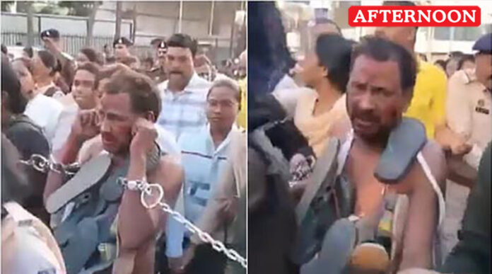 A man arrested for attacking a woman police officer during an anti-mining protest in Chhattisgarh was paraded through the streets wearing a garland of sandals before being produced before a court, triggering wide public attention.