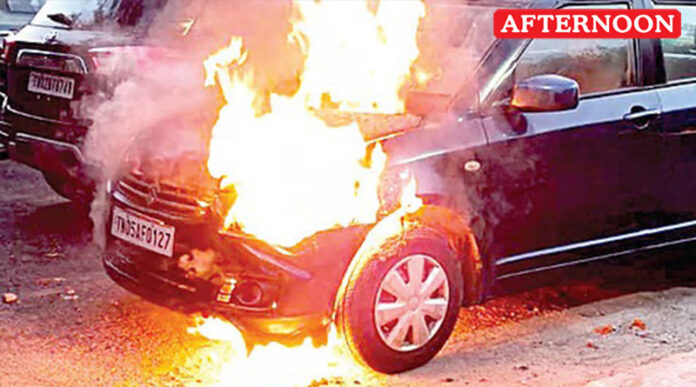 Personnel from the Thiruvallikeni Fire Station rushed to the spot and brought the blaze under control. However, the car was reduced to a charred shell.