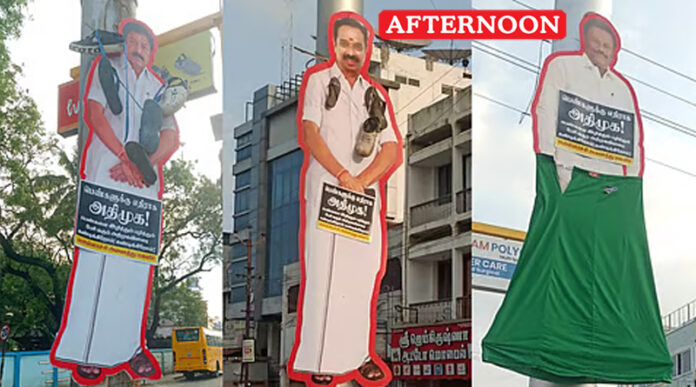 Tension prevailed in Pollachi after unidentified persons staged a protest by placing sandal garlands on the portraits of former AIADMK ministers C.V. Shanmugam, Dindigul Srinivasan and M.R. Vijayabaskar.