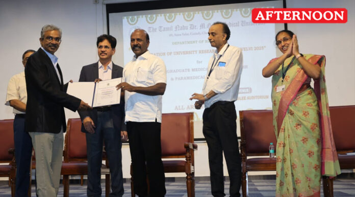 The award was presented during the Research Day celebrations organized by The Tamil Nadu Dr. M.G.R. Medical University. Health and Family Welfare Minister Thiru Ma. Subramanian handed over the honors to institutions, faculties, and students who excelled in various competitions.