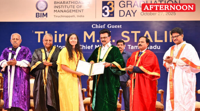 Chief Minister M.K. Stalin urged students graduating from Bharathidasan University to uphold social responsibility and moral values while contributing to the progress of Tamil Nadu and the nation. He made these remarks while attending the convocation ceremony of the Bharathidasan Institute of Management (BIM) in Tiruchirappalli, where he also conferred degrees upon graduating students.