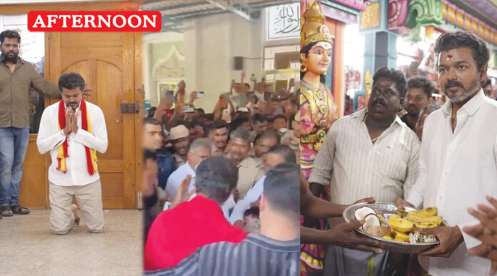 Highlighting communal harmony, Vijay visited places of worship across faiths. He offered prayers at St. Anthony’s Church on Wireless Road, prostrated at Sri Bachanachi Amman Temple near Kottapattu, and later visited Noorul Huda Mosque in KK Nagar, where he interacted with mosque representatives and sought support.