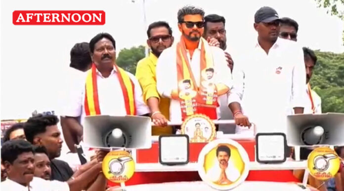 Navalpattu Viji, the party’s nominee for the constituency in Tiruchirappalli district, began his procession from the BHEL premises. Accompanied by supporters, drumbeats and dance performances, he travelled in an open campaign vehicle carrying the statue of Vijay before reaching the Thiruverumpur Taluk Office.